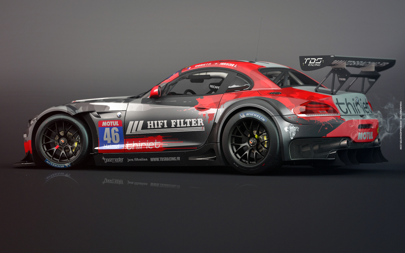 Etude réalisé pour le Team TDS Racing, qui participera à bord de cette BMW Z4 GT3 au championnat GT Tour 2013. l’asymétrie propre à l’écurie ne pouvant être conservée, la bascule des couleurs se fait de l’avant à l’arrière, afin de conserver la dynamique de la première voiture. Elle sera pilotée par Pierre Thiriet et Jonathan Hirschi.